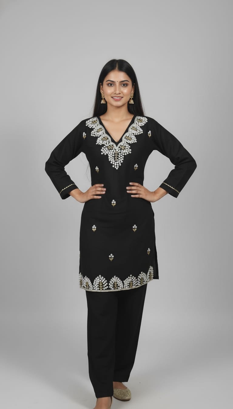 Elevate your festive and party wardrobe with this premium black straight-fit kurta and pant set, beautifully embellished with fine mirror and thread work detailing. The neckline features...