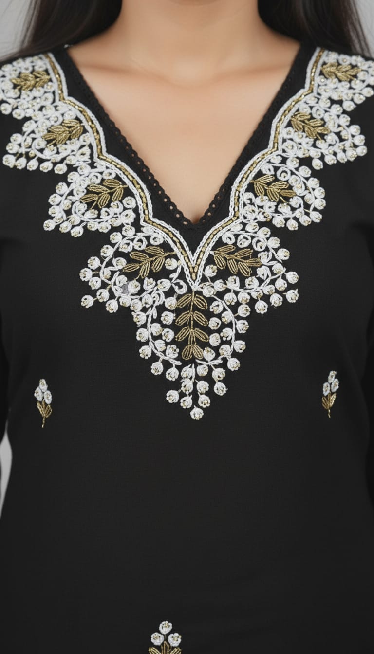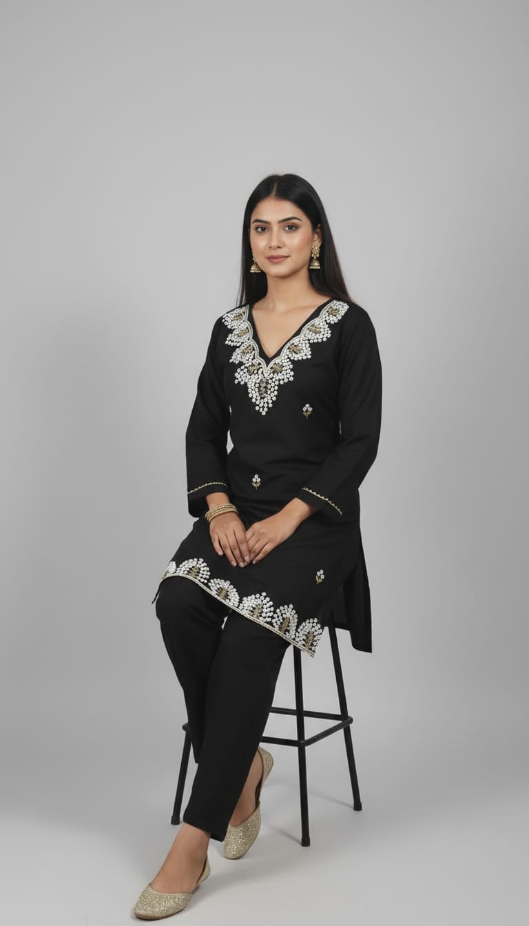 Elevate your festive and party wardrobe with this premium black straight-fit kurta and pant set, beautifully embellished with fine mirror and thread work detailing. The neckline features intricate hand embroidery, adding a touch of grace and elegance. Subtle motifs throughout the kurta and a bordered hem design enhance its luxurious look.
