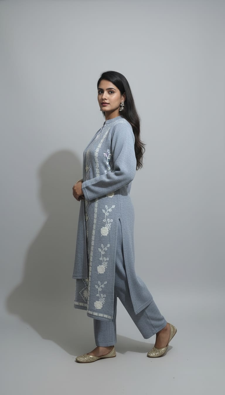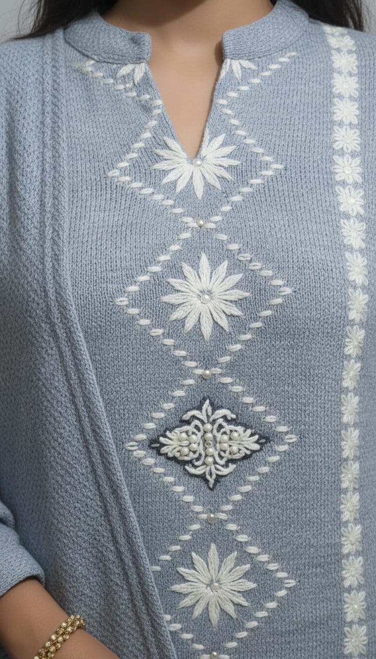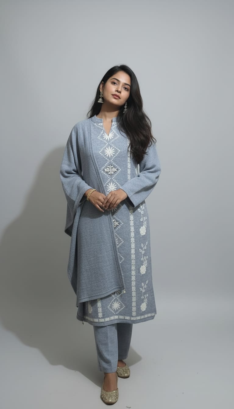 Step into timeless elegance with our Ice-Blue Kashmiri Embroidered Winter Suit, designed for ultimate comfort and style. Crafted from premium soft wool fabric, this outfit is perfect for the winter season while preserving a graceful ethnic charm.