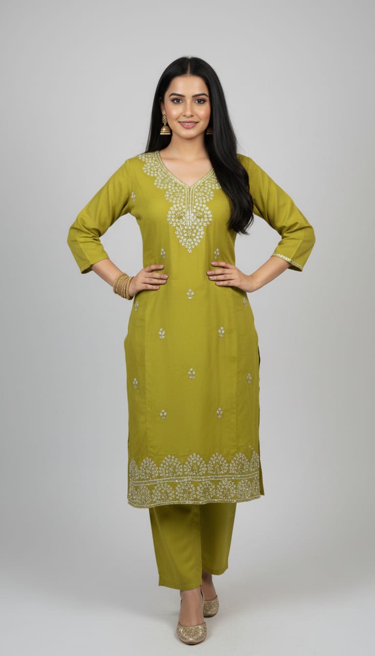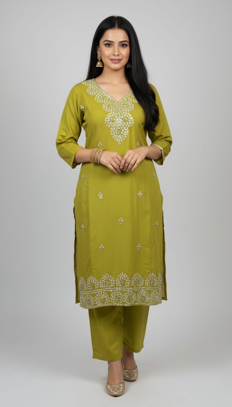 Paired with matching straight pants, this outfit is perfect for festive celebrations, family gatherings, casual parties, and traditional events. Style it with jhumkas and bangles for a complete ethnic look.