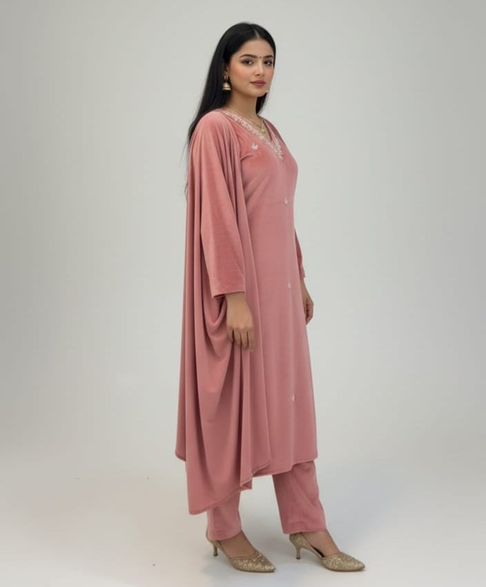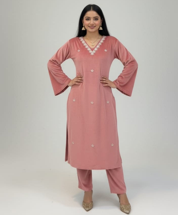 Elevate your festive and party wardrobe with this stunning Peach pink Velvet Embroidered Suit Set. Crafted from premium soft velvet fabric, this elegant outfit offers a luxurious feel and a graceful drape. The kurta features a stylish V-neckline adorned with delicate silver zari embroidery, along with subtle embroidered motifs on the front for a refined, classy look. It comes paired with matching straight-fit pants and a beautifully coordinated  dupatta that adds an extra touch of sophistication.